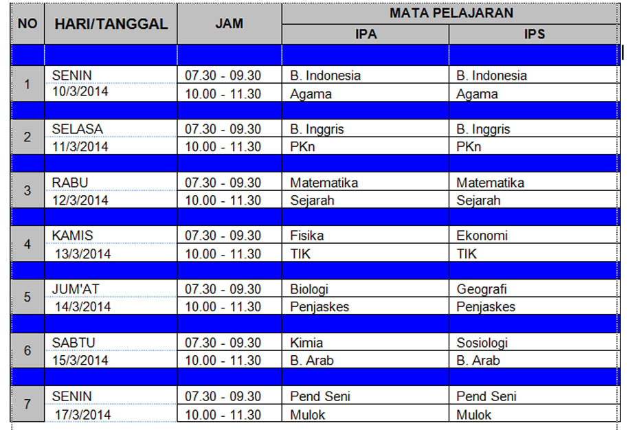 Sehubungan akan dilaksanakannya Ujian Sekolah tahun pelajaran 2013/2014, diberitahukan bahwa kegiatan ulangan tertulis akan dilaksanakan mulai tanggal 10 s.d. 17 Maret 2014, sedangkan Ujian Praktik telah dilaksanakan sebelumnya. Berikut jadual lengkap Ujian Sekolah :